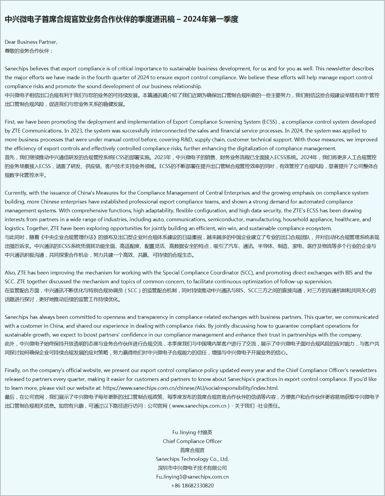 中兴微电子首席合规官致业务合作伙伴的季度通讯稿 – 2024年第一季度