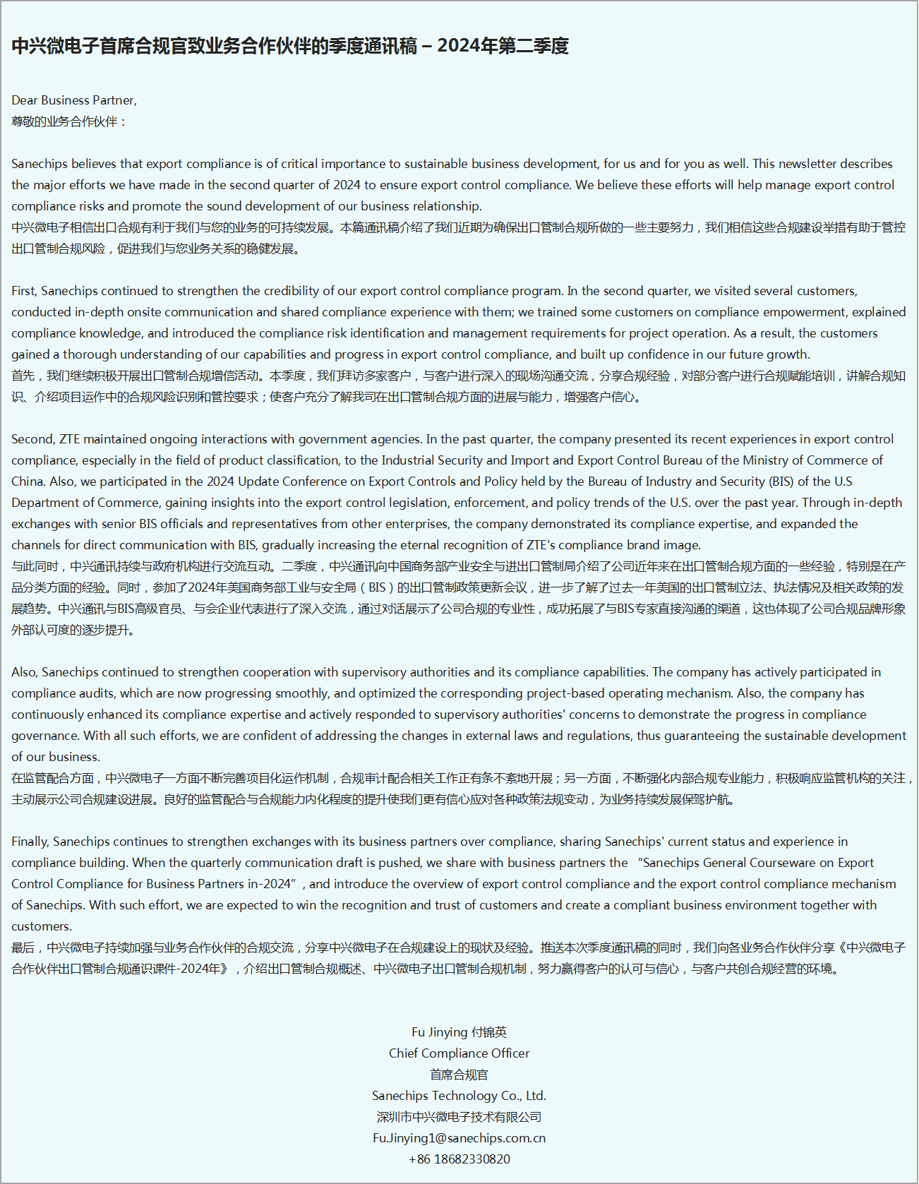 中兴微电子首席合规官致业务合作伙伴的季度通讯稿 – 2024年第二季度